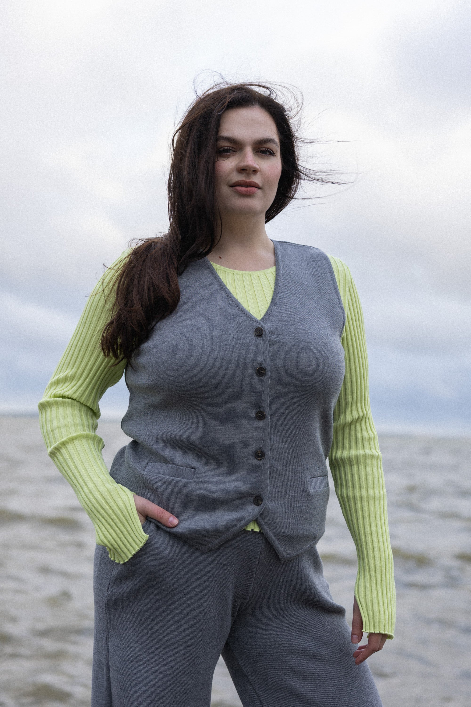 Galante adītā veste ir stilīgs klasiskā apģērba stila papildinājums. Tai ir nedaudz brīva forma ar bio pogām priekšpusē un regulējamu jostu aizmugurē. Galante uzreiz kļūs par jūsu iecienītāko apģērbu, viegli iekļaujoties pārējā garderobē.