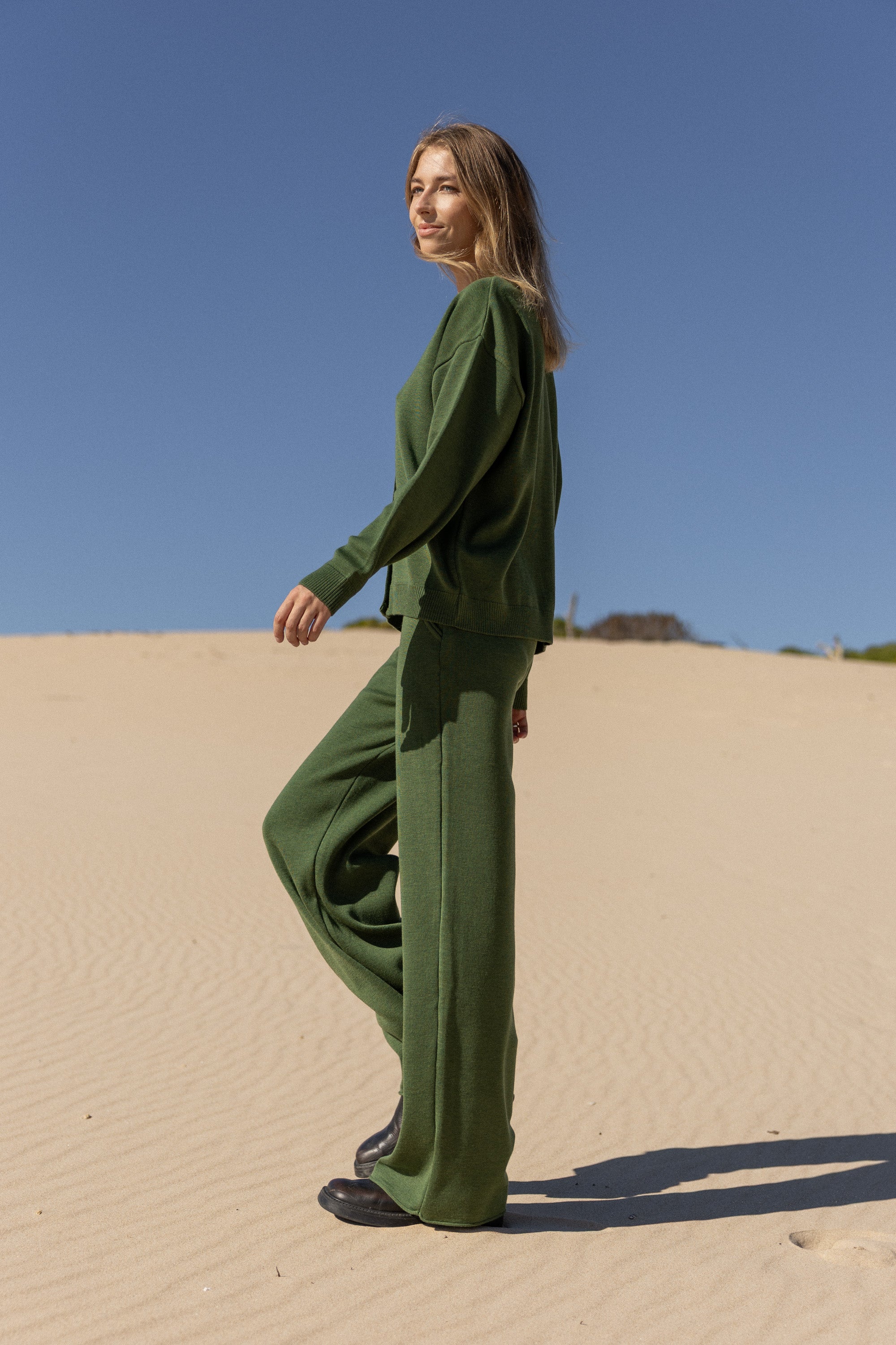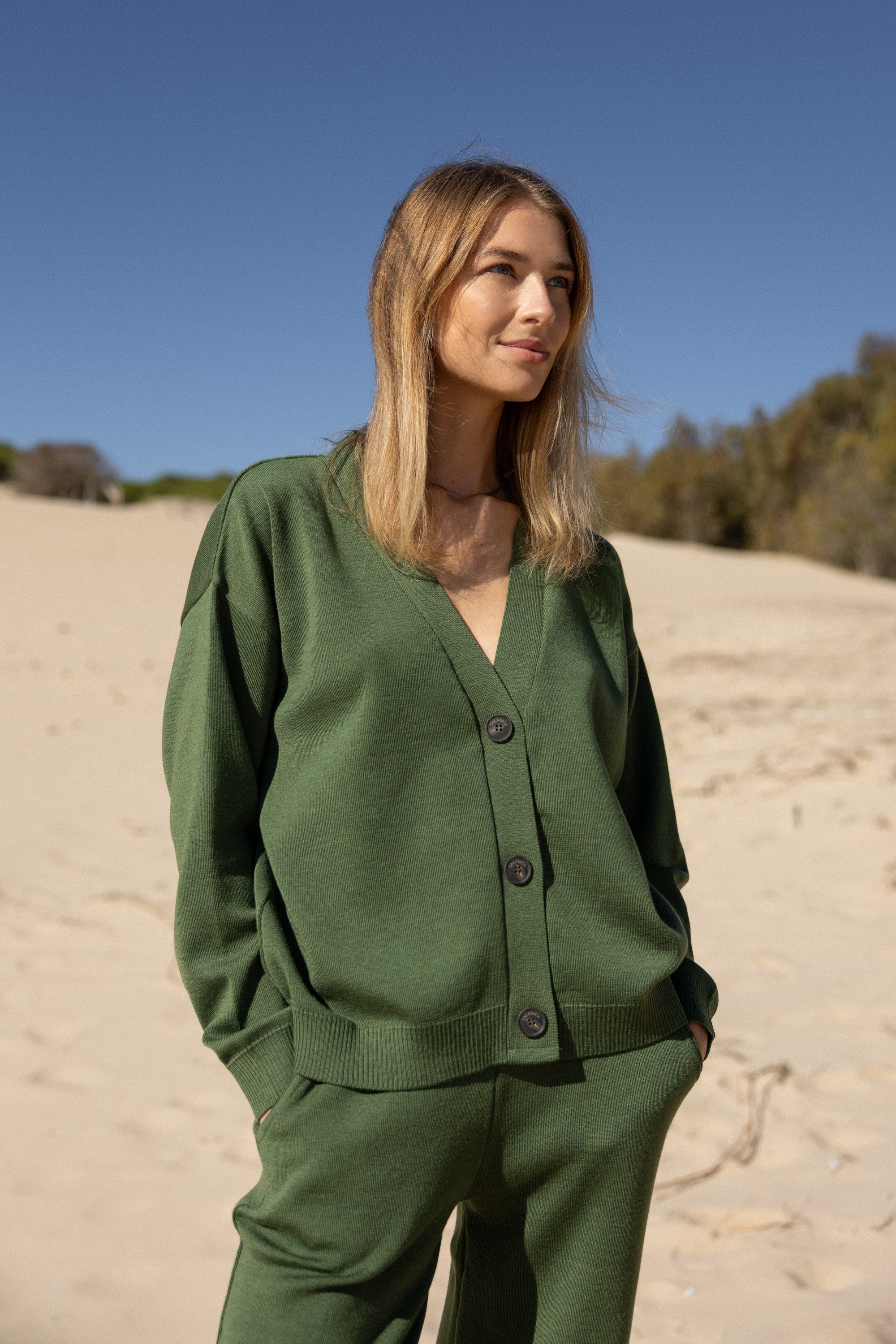 Bene pants and cardigan set is spun from 100% RWS-certified extra fine merino wool that makes them warm and extra comfy. The cardigan is crafted for versatility and thoughtfully designed as One Size with a relaxed silhouette, dropped shoulders, and a V-neckline adorned with our signature logo buttons.